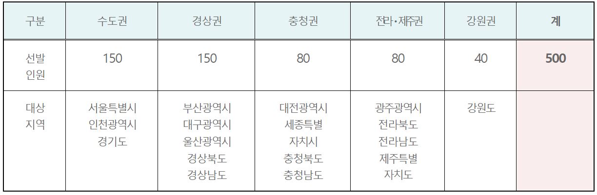 수도권, 경상권 각 150명, 충청권과 전라/제주권 각 80명, 강원권 40명 등 총 500명을 모집 하지만 신청 상황에 따라 권역별 최종선발 규모는 조정될 수 있습니다.