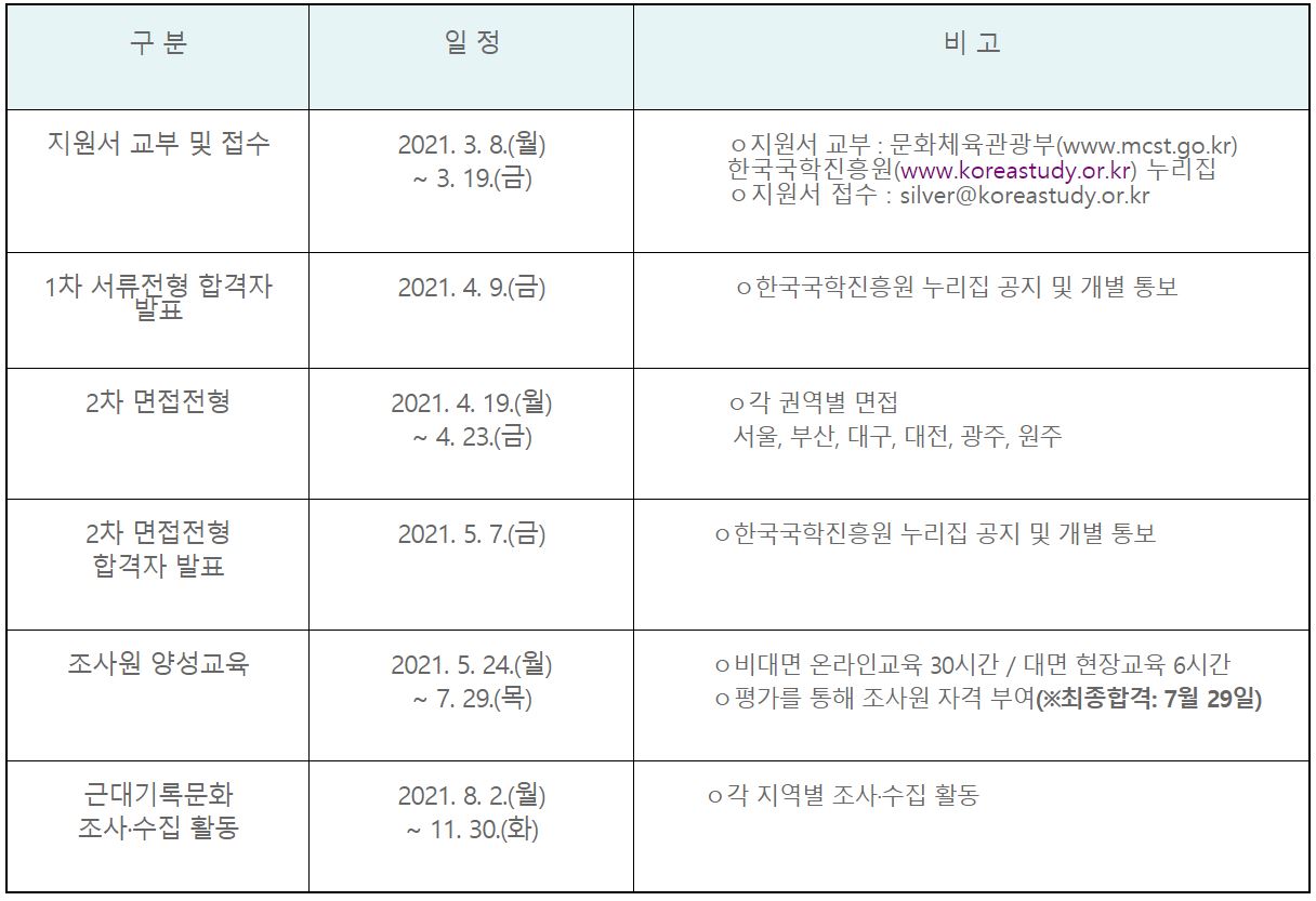 지원서 교부 및 접수, 합격자 발표, 면접 전형, 양성교육, 조사 및 수집 활동 등에 대한 세부 일정은 아래 표를 참고하시기 기 바랍니다.